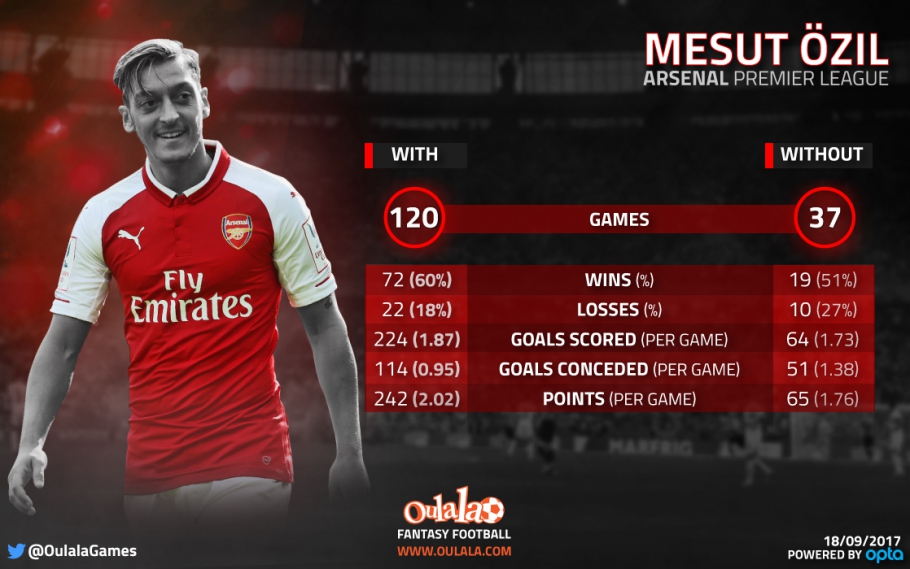 Arsenal win more, lose less, score more, concede fewer goals and pick up more points when Mesut Ozil plays, stats published by fantasy football game Oulala.com reveal.