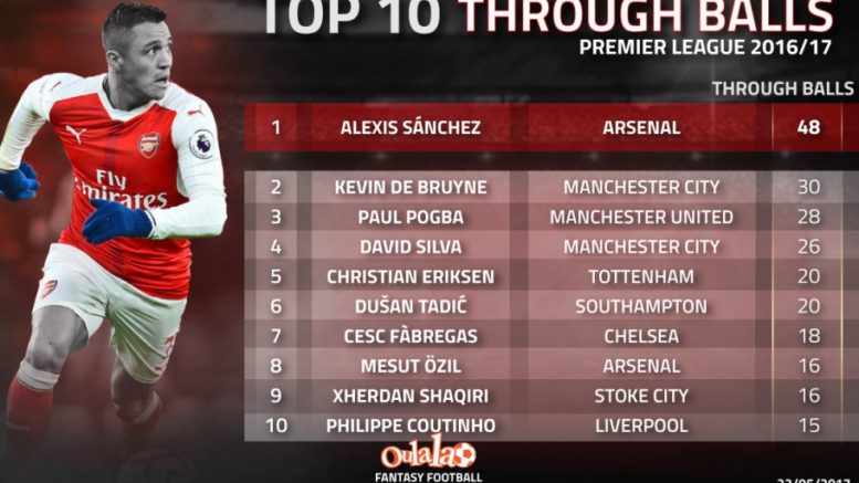 Arsenal’s Alexis Sanchez registered the most through balls during the 2016/17 Premier League campaign, statistics show.