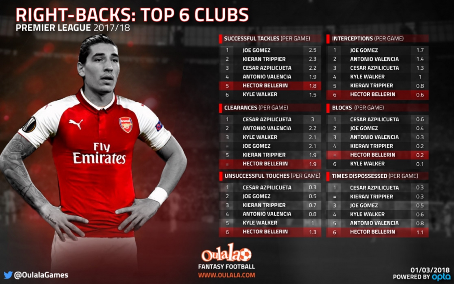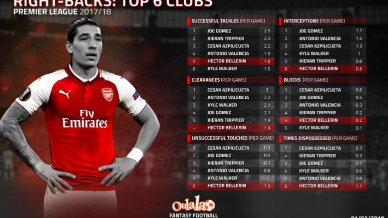 Bellerin has been the worst performing right-back from the Premier League’s top six clubs this season, analysis from daily fantasy football game Oulala.com shows. [phone]