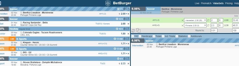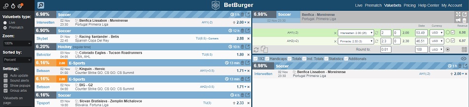 One of the leaders in this field now is BetBurger. The scanner gathers data of 100+ bookies, so you always have extensive selection of events and wagers. Moreover, the functional enables you setting the issuance of information according to particular preferences: