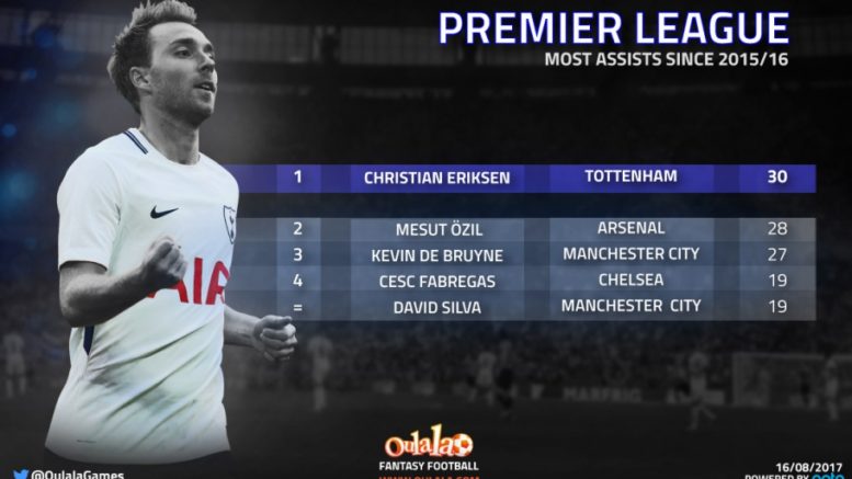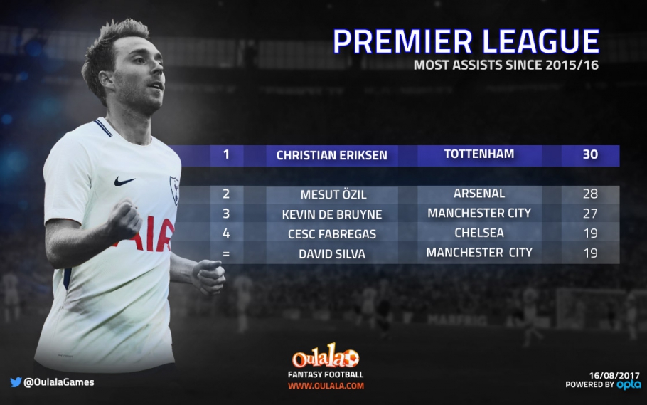 Stats from Opta, published by Fantasy football game Oulala.com, show Eriksen has been the Premier League’s most creative player since August 2015, ahead of Arsenal’s Mesut Ozil (28), Chelsea’s Cesc Fabregas (19) and Manchester City duo Kevin De Bruyne (27) and David Silva (19).
