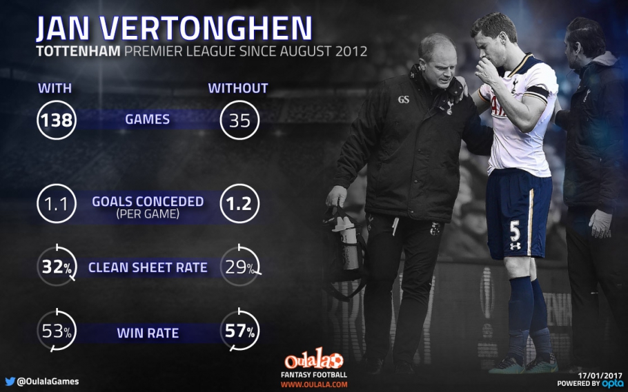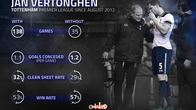 With Vertonghen, Spurs have won 73 of 138 games (53%). However, without him they have won 20 of 35 matches (57%).
