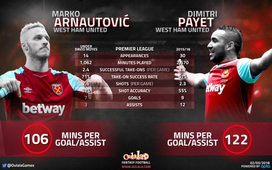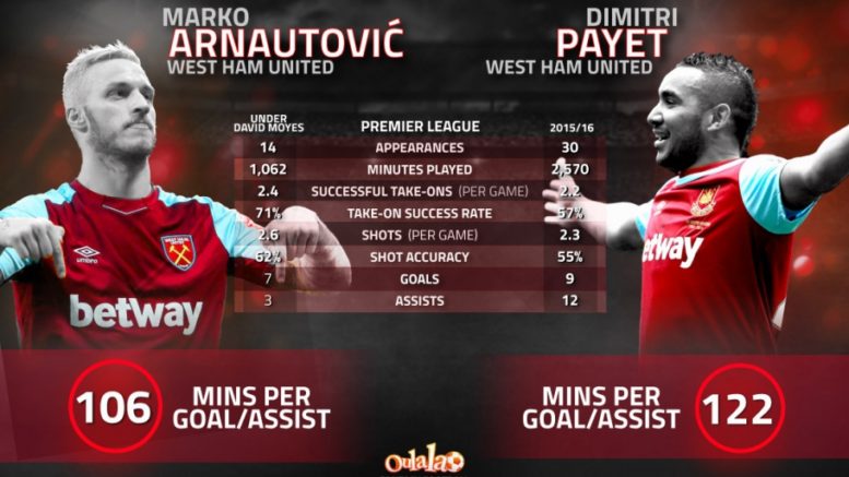 Since Moyes’ first game in charge, stats show Arnautovic has not only topped Payet for dribbling and shooting, he has been directly involved in goals far more often.